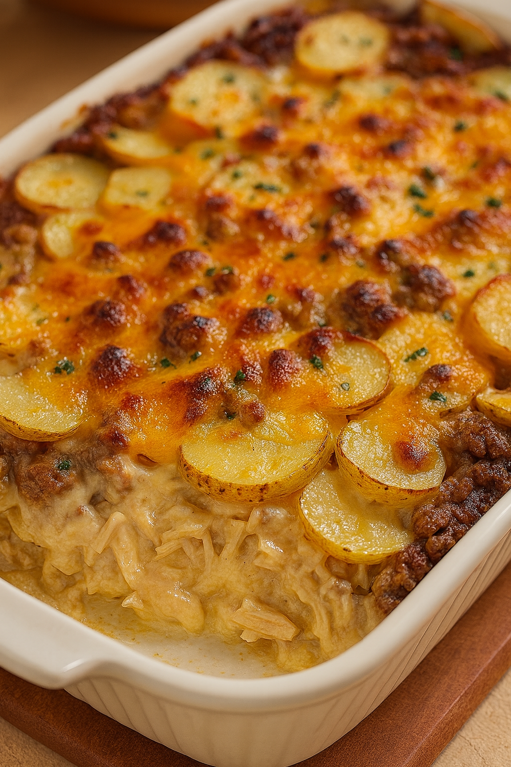 Some recipes never go out of style—and Meat & Potato Casserole is one of them. Combining layers of seasoned ground beef, tender potatoes, and a creamy, cheesy sauce, this dish is the definition of hearty comfort food.